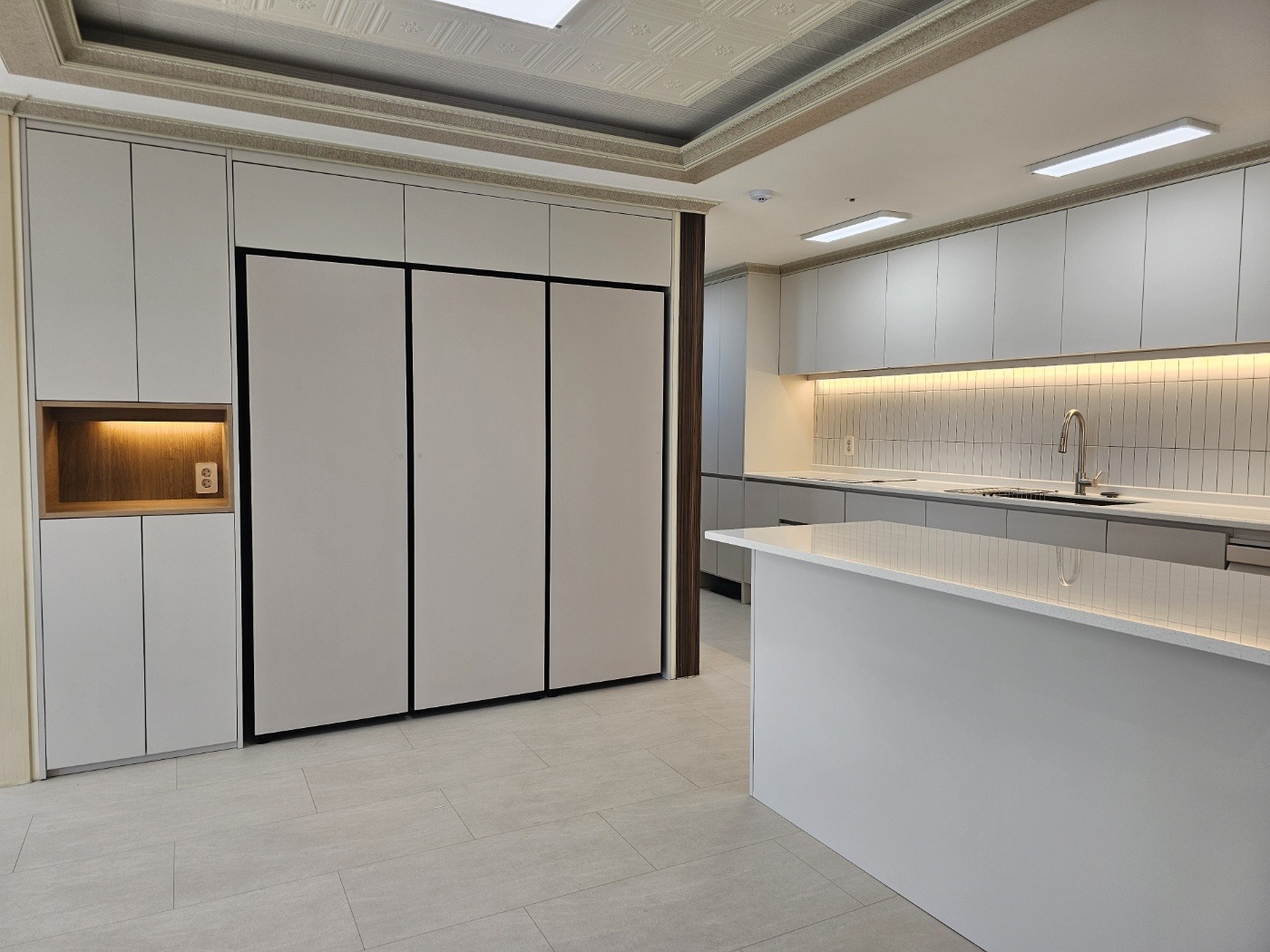 아일랜드형 주방은 기존 조리대 외에 중앙에 독립된 작업대를 설치한 구조로, 요리와 식사, 소통이 동시에 가능한 멀티형 주방입니다. 이 구조는 단순히 요리를 위한 공간을 넘어 가족이 함께 모여 시간을 보내는 중심 공간으로 기능하는 경우가 많습니다. 아일랜드 주방의 가장 큰 특징은 공간의 중심을 차지하면서도 개방적인 구조라는 점입니다. 주방이 하나의 섬처럼 배치되어 있어, 사방이 열려 있고 조리 중에도 다른 공간과의 소통이 자연스럽습니다. 이는 특히 오픈형 구조를 선호하는 현대 가정이나 홈파티, 손님 접대가 잦은 가정에서 큰 장점으로 작용합니다. 기능적인 측면에서는 아일랜드를 통해 작업 공간과 수납 공간을 동시에 확보할 수 있다는 장점이 있습니다. 조리대 외에도 넓은 작업 면적이 생기기 때문에 요리 동선이 편리하고, 하부장을 활용한 넉넉한 수납이 가능해집니다. 아일랜드 하부에 전자레인지, 식기세척기, 와인셀러 등을 빌트인으로 구성하면 고급스러운 느낌까지 더할 수 있습니다. 인테리어 팁으로는, 아일랜드 상판을 내열성과 내구성이 강한 소재로 선택하는 것이 중요합니다. 인조 대리석이나 엔지니어드 스톤이 대표적이며, 조명을 고급스러운 펜던트 조명으로 설치하면 시각적인 포인트와 분위기를 동시에 잡을 수 있습니다. 또한 바 의자와 함께 구성하면 아침식사나 간단한 티타임 공간으로도 활용할 수 있습니다. 다만 아일랜드형 주방은 넓은 공간이 필요하기 때문에 소형 주택이나 아파트에서는 적용이 어려운 경우도 있습니다. 공간이 부족한 상태에서 무리하게 설치하면 오히려 동선을 방해하거나, 공간을 좁아보이게 만들 수 있으니, 공간 설계 시 충분한 여유 공간 확보가 중요합니다.